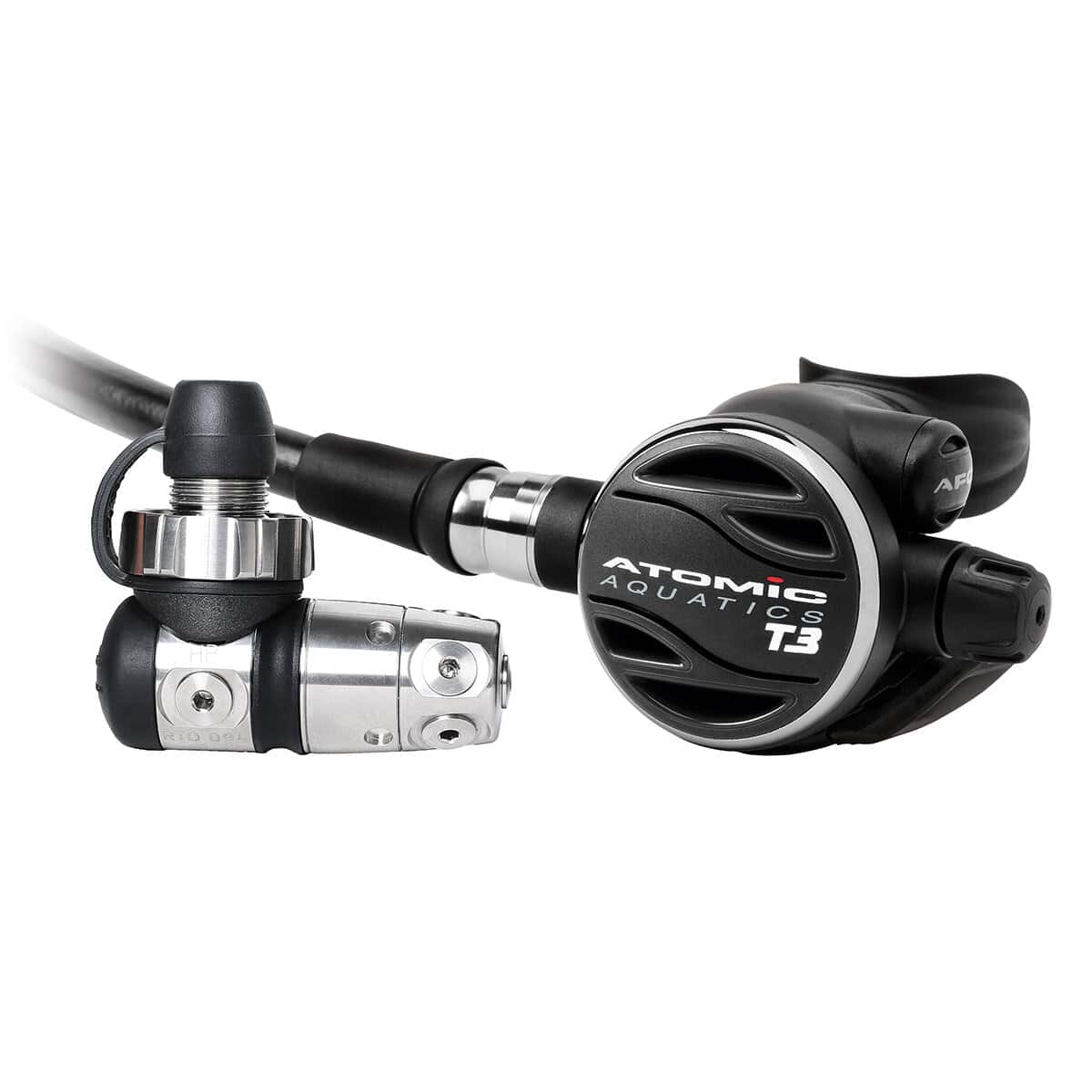 - Pneumatically-balanced poppet, high-flow case and lever design for easy breathing at all depths and tank pressures. Patented Atomic Aquatics AFC – Automatic Flow Control.