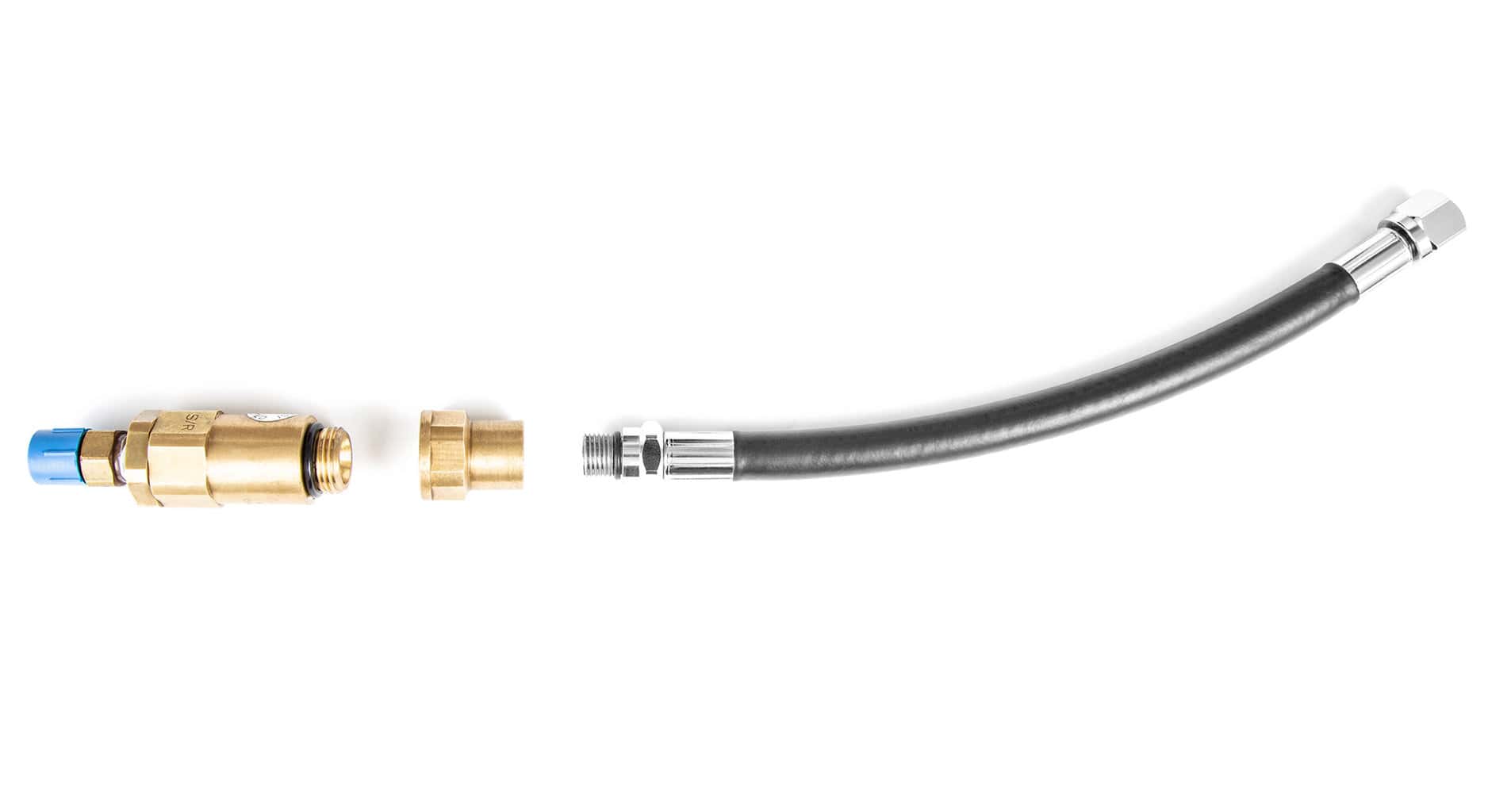 A “jumper” scuba hose must always be used to connect the main gas supply through a one way valve and to the side block on the pod. A big bore “jumper” hose comes with the pod which includes an adapter to secure the one way valve directly to the umbilical gas supply hose.