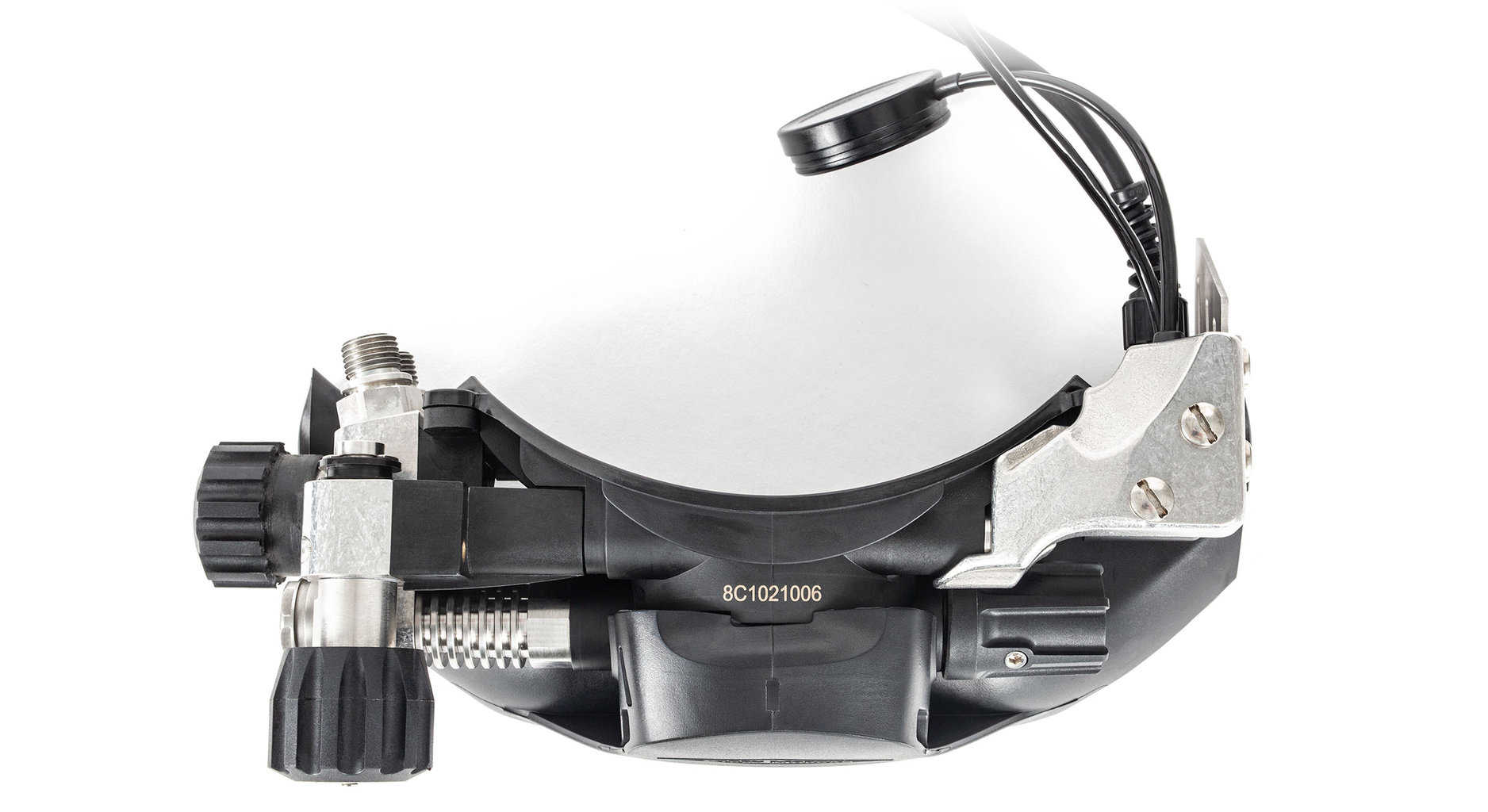 This unique Surface Supplied pod incorporates a side block with two inlets. One for main gas, and the other for the EGS supply, a complete, modular communications system is neatly tucked in close and well protected, and terminates into a newly designed KMDSI 4 pin waterproof connector. The oral cavity has an extremely low volume that greatly reduces residual levels of CO2.