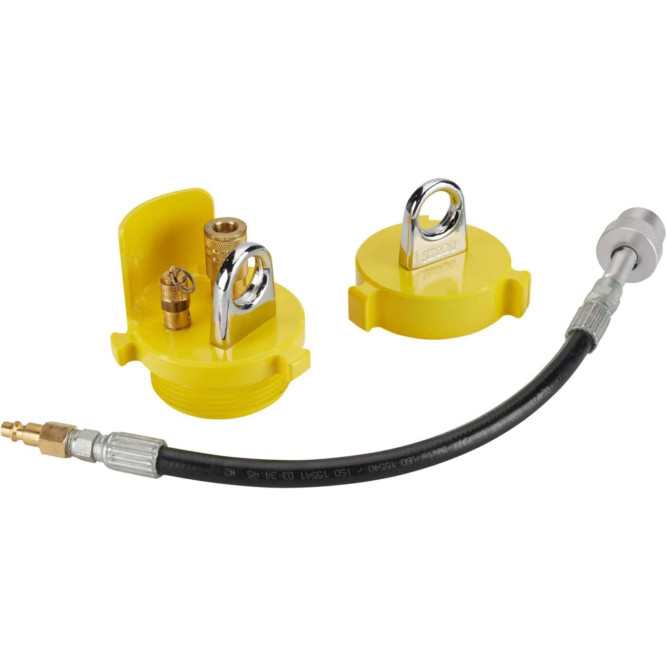 - The 2-1/2″ male aluminum hose cap has standard quick disconnect fitting for attaching your filler hose.and a tie down for securing a safety line.