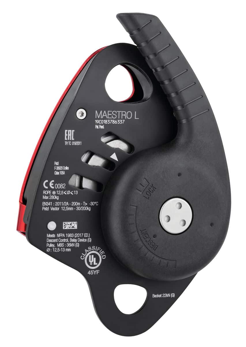 MAESTRO L is a descender designed for technical rescue operations. It facilitates manipulation of heavy loads, for lowering or hauling, and may be used in both the primary system or in a back-up belay. This versatility allows rescuers to adapt to any situation they may encounter on the rescue scene. The ergonomic handle and integrated brake allow for comfortably controlled descent. Shifting from lowering position to hauling position is immediate, without the need to transfer the load. The integrated progress-capture pulley has a large diameter sheave mounted on sealed ball bearings, ensuring excellent hauling efficiency. The AUTO-LOCK system automatically locks the rope when the handle is not in use. Once locked, the rope can be taken up without having to manipulate the handle. The MAESTRO L descender is compatible with 12.5 to 13 mm ropes and allows handling of loads up to 280 kg.
