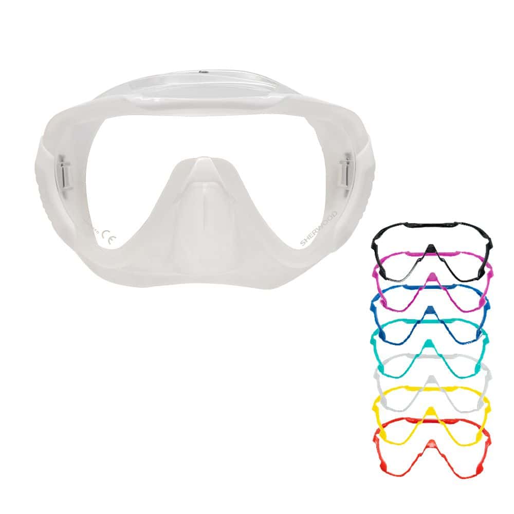 Discover the latest addition to the Sherwood family: the NEW Sherwood Mimic Slim, meticulously tailored for smaller faces. Boasting a wide-view single lens design, low volume, and a comfortable fit, this mask mirrors the exceptional features of its counterpart on a more compact scale. Elevate your style effortlessly with seven interchangeable color frame inserts, allowing seamless coordination with your gear, preferred color schemes, or mood. Opt for the sleek black or clear silicone skirt options, ensuring a personalized and comfortable diving experience with the Sherwood Mimic Slim.