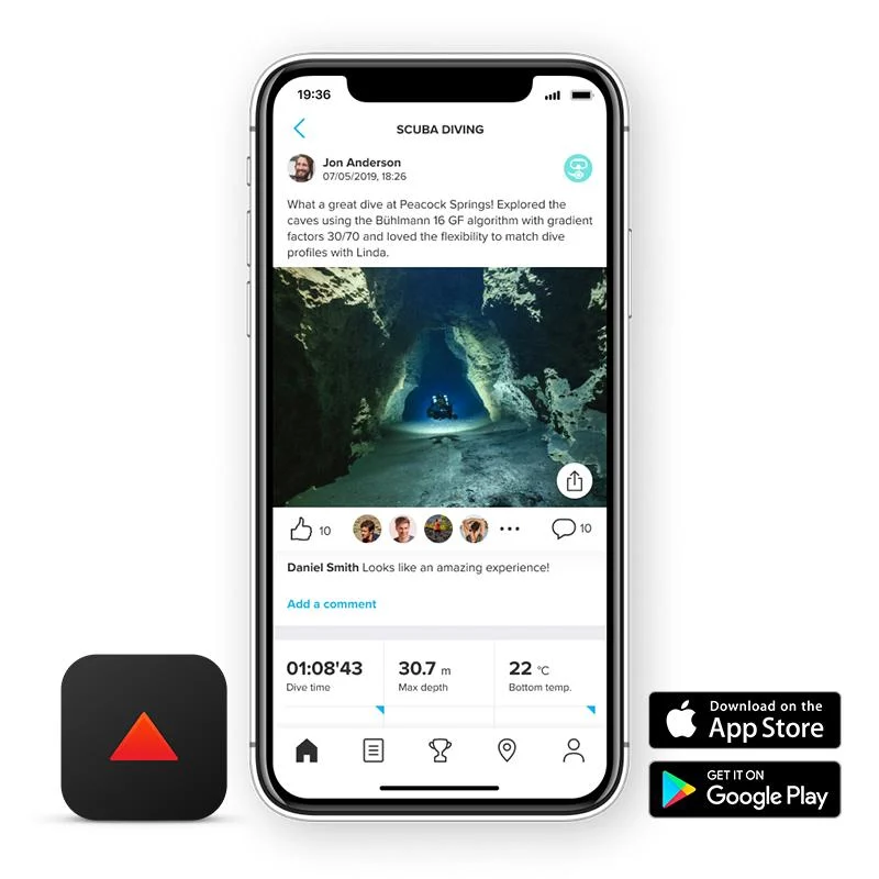 Transfer your dive logs easily over Bluetooth to your mobile phone. In Suunto app you can relive, and share your diving adventures, build an all-inclusive dive history by enriching your dive logs with photos, comments and dive location. Review and analyze your dive data including dive time, maximum depth, device settings, gas consumption (when using Suunto Tank POD).